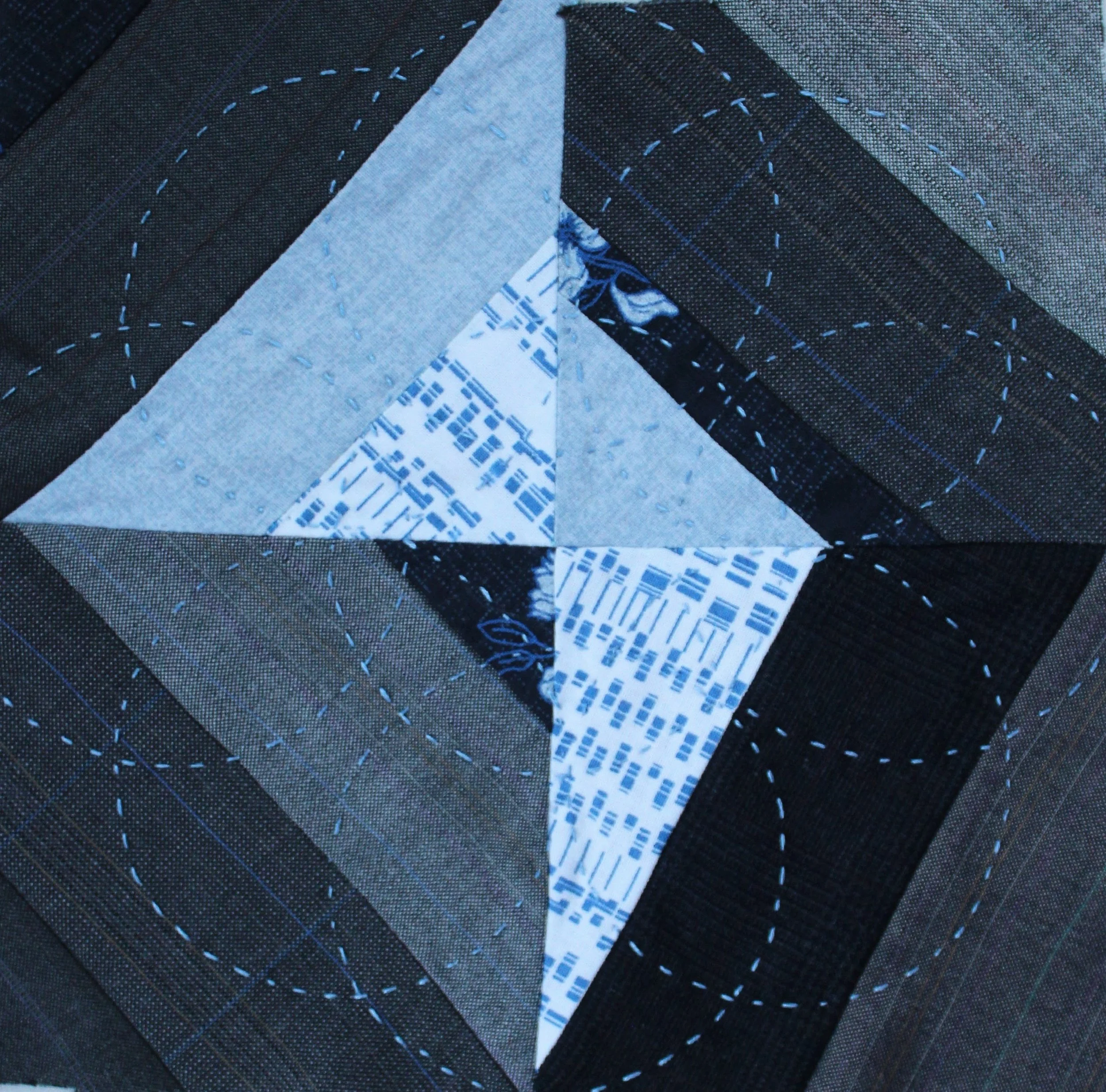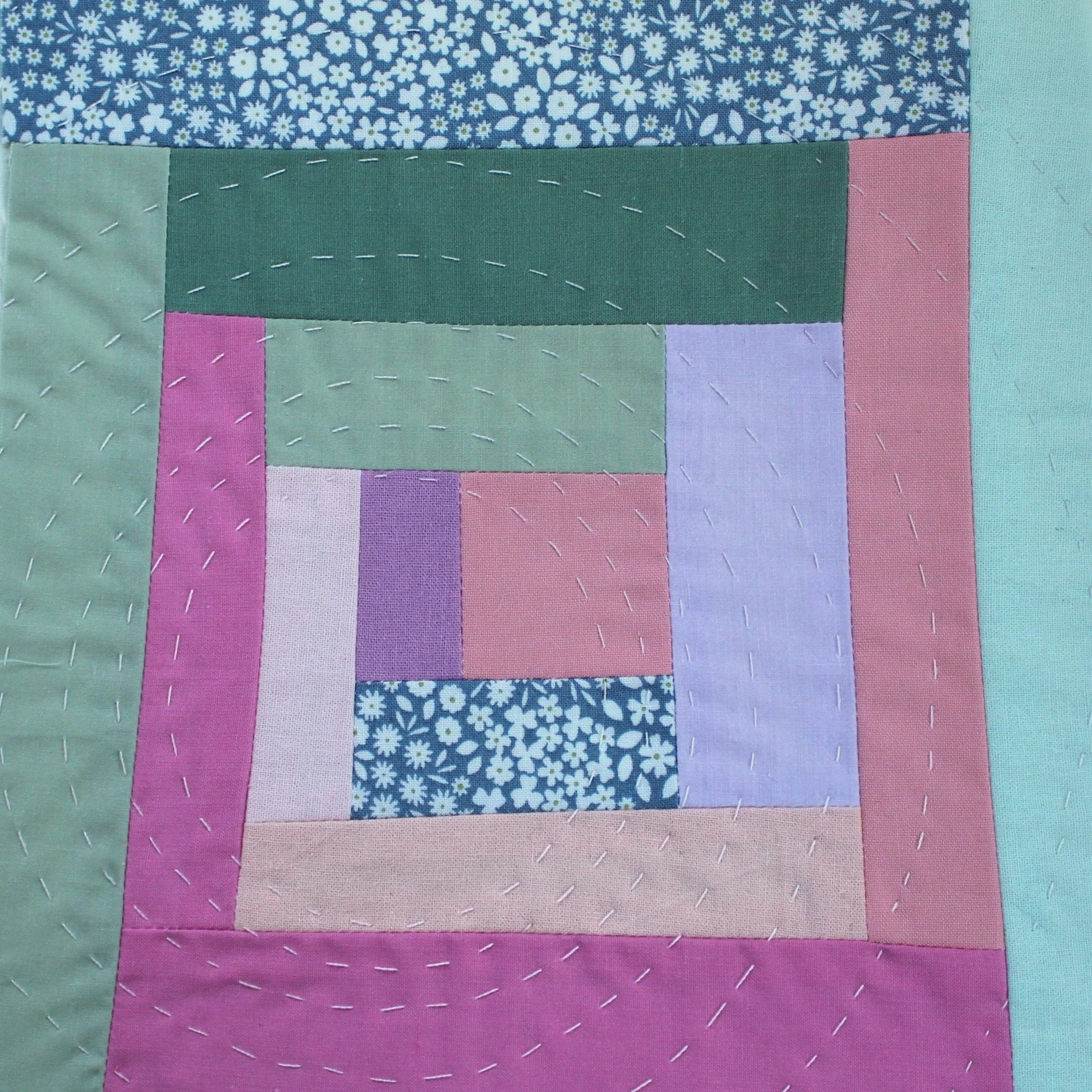 'Lido' Machine pieced log cabin block, with hand-sewn embellishment.